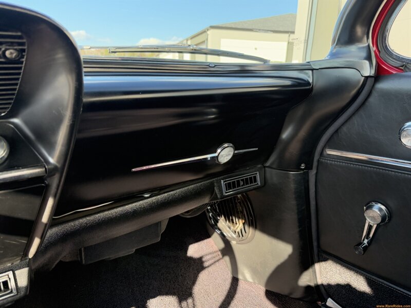 The dark red finish is deep, glossy, and dramatic—exactly what you want on a car with this much presence. The paint lays smooth across the body, highlighting the long, elegant body lines. The goldleaf and pinstriping are outstanding details that elevate the car from “nice classic” to “custom with personality.” It presents beautifully and is sure to set this Bel Air apart from the crowd, even in a crowd of Bel Airs.